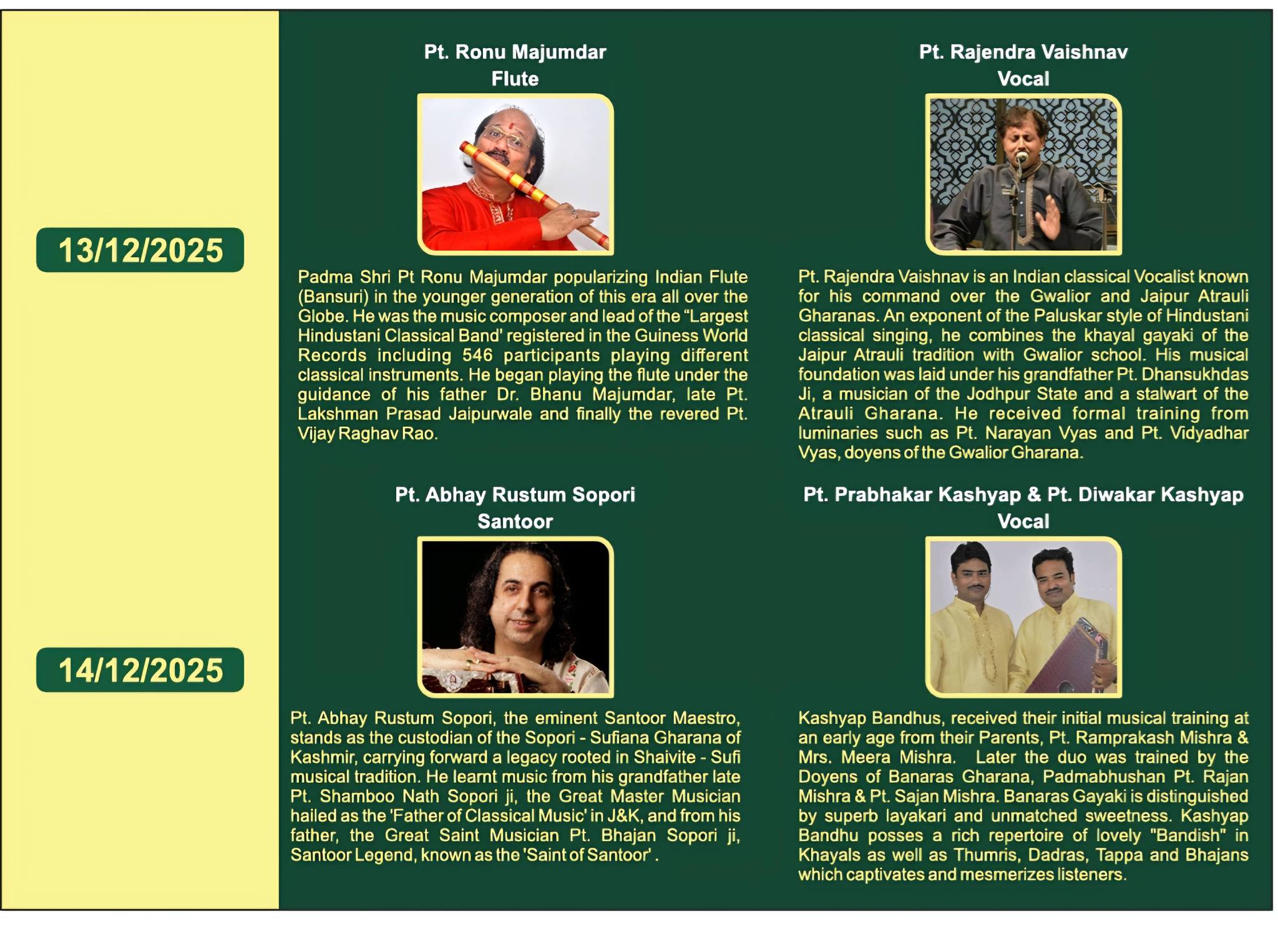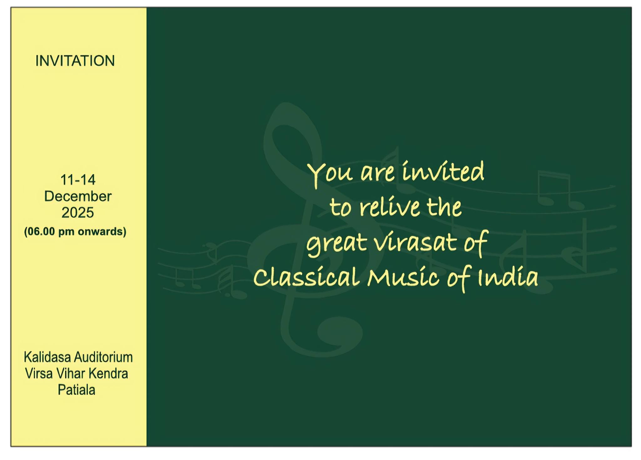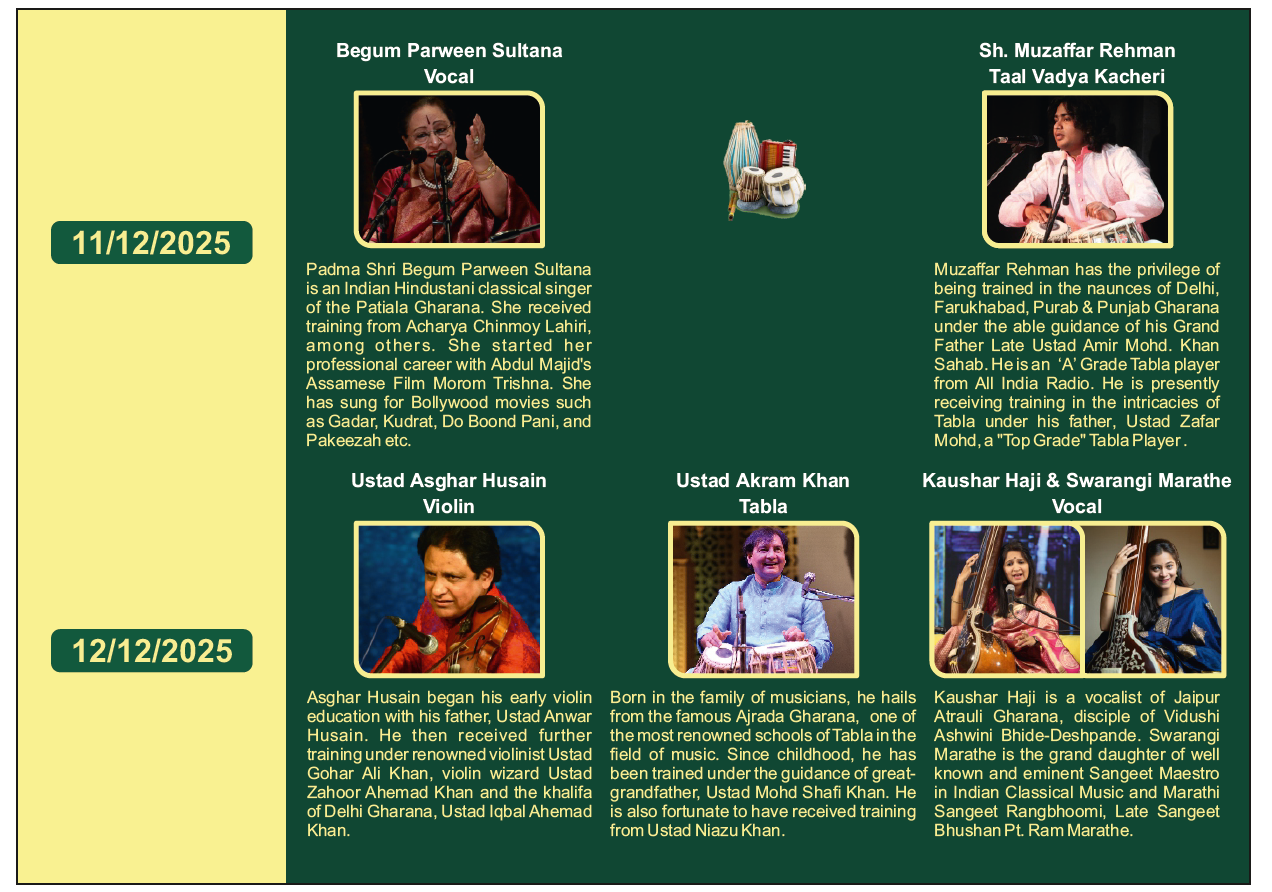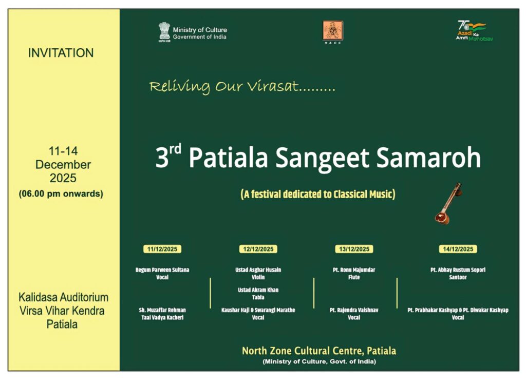 Dec 13, 2025 NZCC आयोजन, समाचार Comments Off on तीसरा पटियाला संगीत समारोह कालिदास ऑडिटोरियम, विरसा विहार केंद्र, पटियाला में
