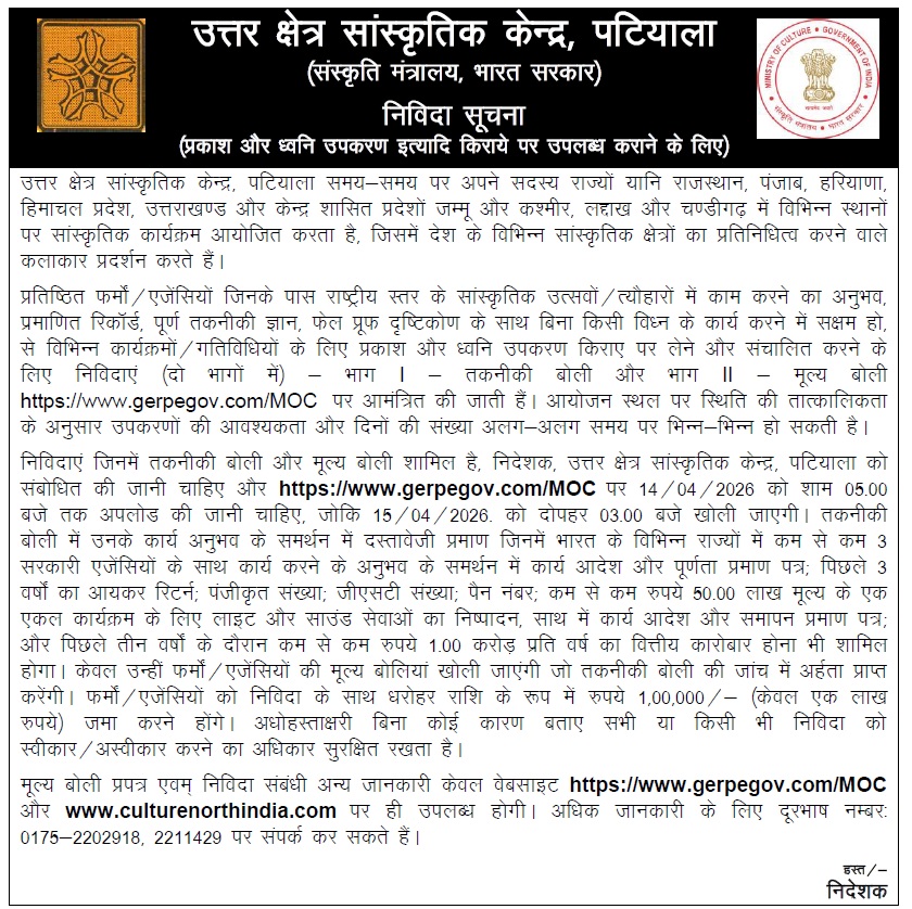 Mar 27, 2026 NZCC निविदाओं Comments Off on प्रकाश और ध्वनि उपकरण इत्यादि किराये पर उपलब्ध कराने के लिए