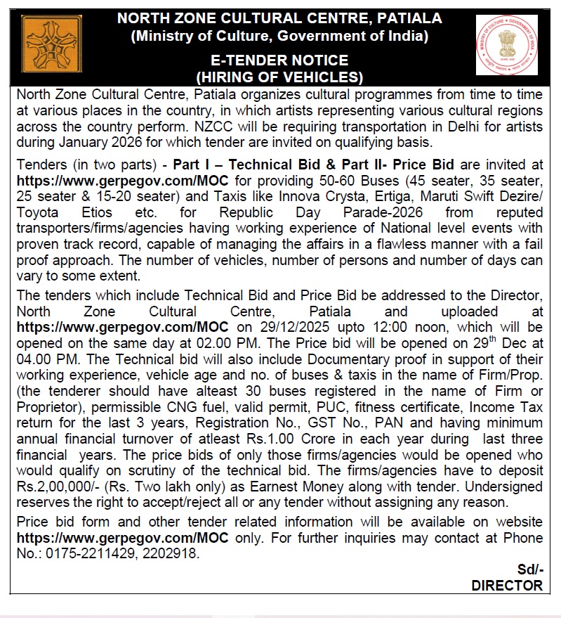Dec 19, 2025 NZCC निविदाओं Comments Off on वाहनों के किराये के लिए ई-टेंडर सूचना