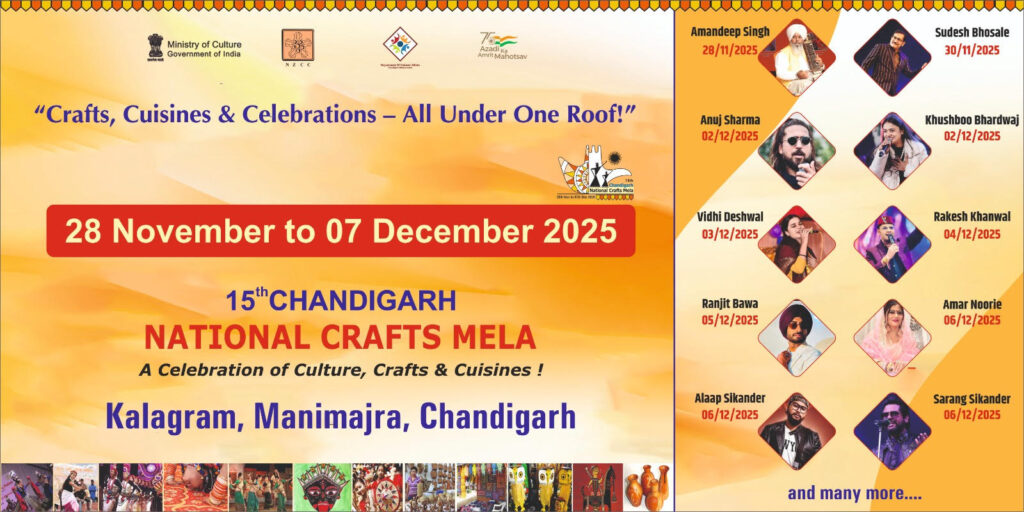 Nov 21, 2025 Comments Off on 15वां चंडीगढ़ राष्ट्रीय शिल्प मेला 28 नवंबर से 7 दिसंबर 2025 तक चंडीगढ़ के कलाग्राम में आयोजित किया जाएगा